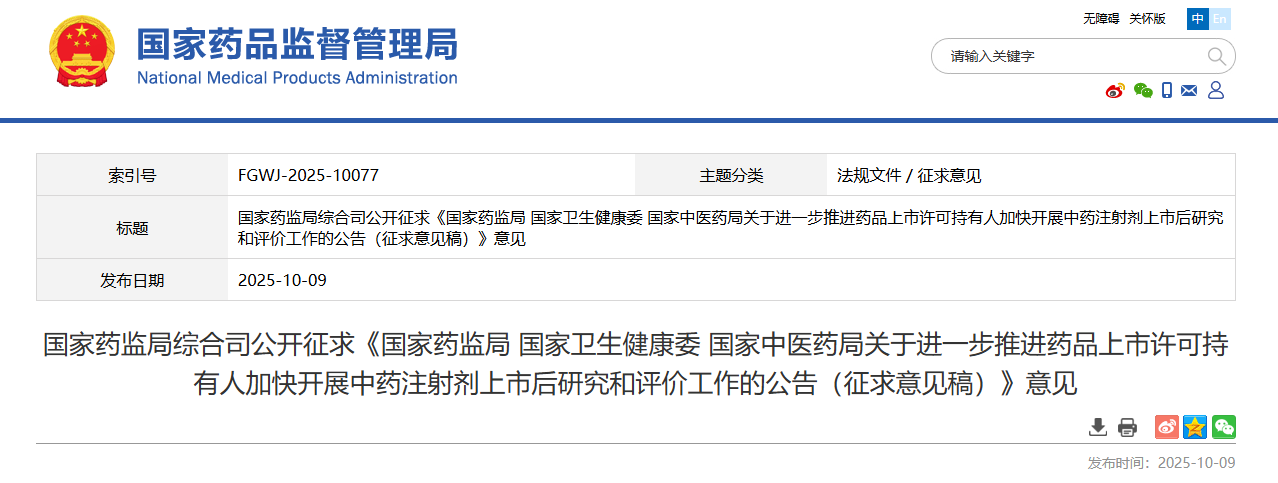 2025年10月9日,国家药监局联合多部门发布《关于进一步推进药品上市许可持有人加快开展中药注射剂上市后研究和评价工作的公告(征求意见稿)》,明确将以药品批文的存续为最终筹码,对无法证明“获益大于风险” 的品种进行集中清理。