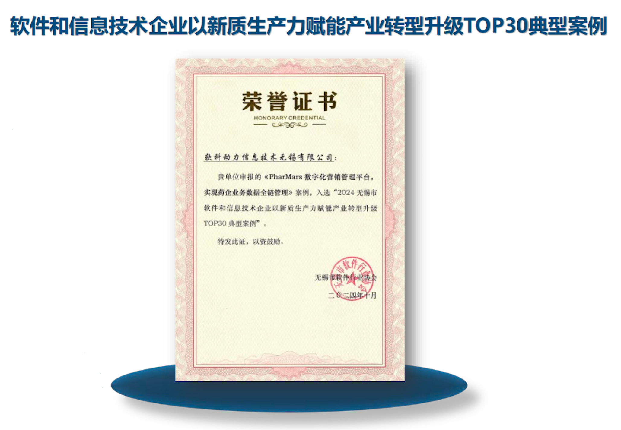 近日,软科动力信息技术无锡有限公司(以下简称“软科动力”)在医药数字化营销领域再获权威认可。公司自主研发的“PharMars数字化营销管理平台”凭借其创新性与行业影响力,成功入选“软件和信息技术企业以新质生产力赋能产业转型升级TOP30典型案例”,并荣获荣誉证书,标志着该平台在行业应用价值与技术自主性上获得高度肯定。