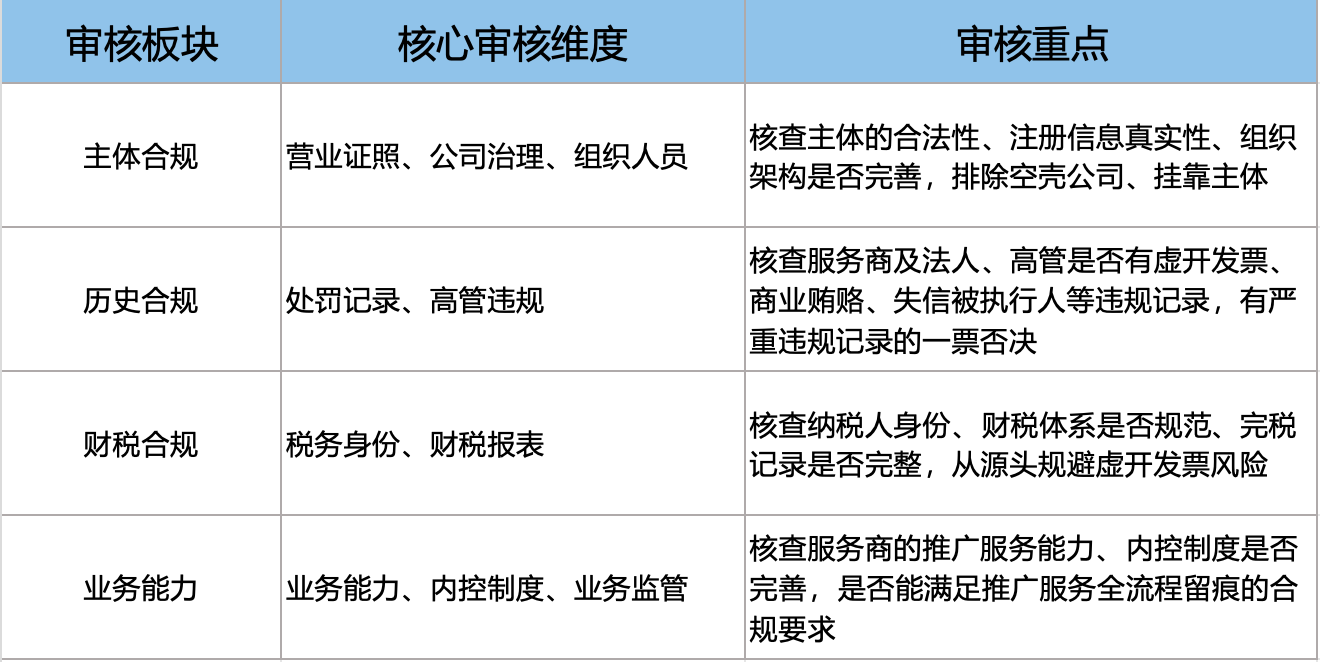 - A 级服务商:年交易额≥500 万的一般纳税人,多为体系完善的核心 CSO 合作主体,需执行全维度严格审核,重点核查公司治理、财税规范、内控制度与历史合规记录;